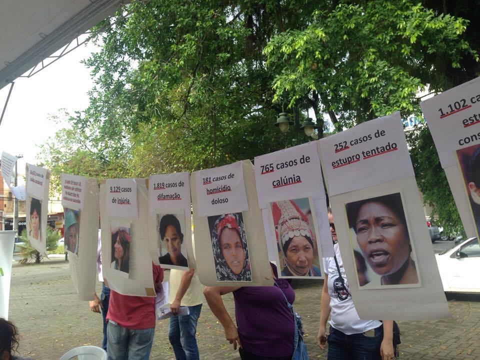 Oito de março foi dia de representação na Praça da Bandeira. No Dia Internacional da Mulher, o Fórum de Mulheres, junto com outras organizações, chamaram a atenção para a desigualdade e violência que as mulheres sofrem, historicamente, no dia a dia. Uma tenda montada na praça abrigava a representação de Maria da Penha e informações sobre a violência contra a mulher em Joinville.